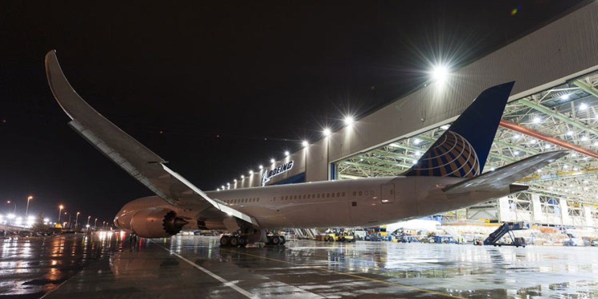 El primer 787-9 Dreamliner de United Airlines salió de la planta de ensamblaje durante la noche del martes en las instalaciones de Boeing en Everett, Washington.