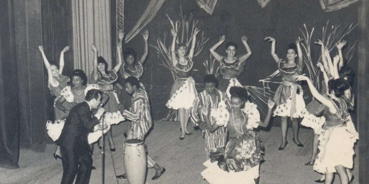 (Show de Alberto Castillo con candomberos afroporteños. Rosario (Santa Fe), ca. 1970. Foto Carlos Gómez. Los afros -casi todos aún vivos- son de la familia Garay, Córdoba y Lamadrid en cuya casa, en Flores, funcionó hasta 1952 Centro Recreativo La Armonía, fundado en 1917. Allí se bailaba tango de la Guardia Vieja).