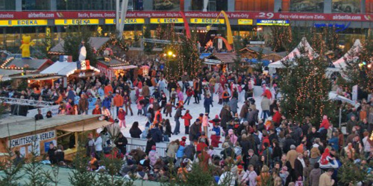 Mercado navideño y patio cervecero en el aeropuerto de Múnich, Alemania