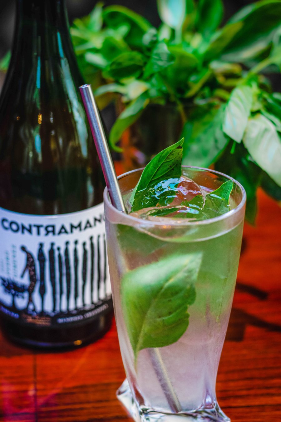 En vaso mezclador: 15ml de bourbon, 15ml de almíbar de ciruela, 60ml de vino criolla.